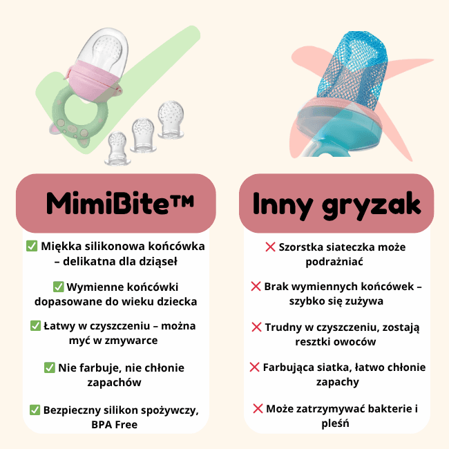 Możesz włożyć do środka owoce, warzywa lub mleko mamy i lekko je zamrozić – chłód przynosi jeszcze większą ulgę obolałym dziąsłom.Co mówią Mamy, ktore wybrały MimiBite